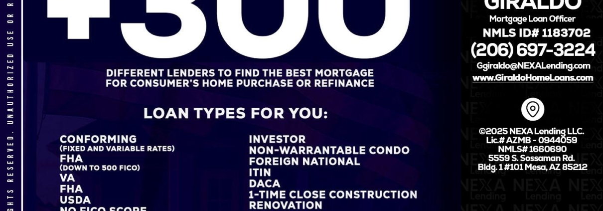 Hi, my name is German Giraldo. I’m a Loan Officer with NEXA Lending LLC., offering personalized mortgage solutions, fast customized quotes, great rates and service with integrity.