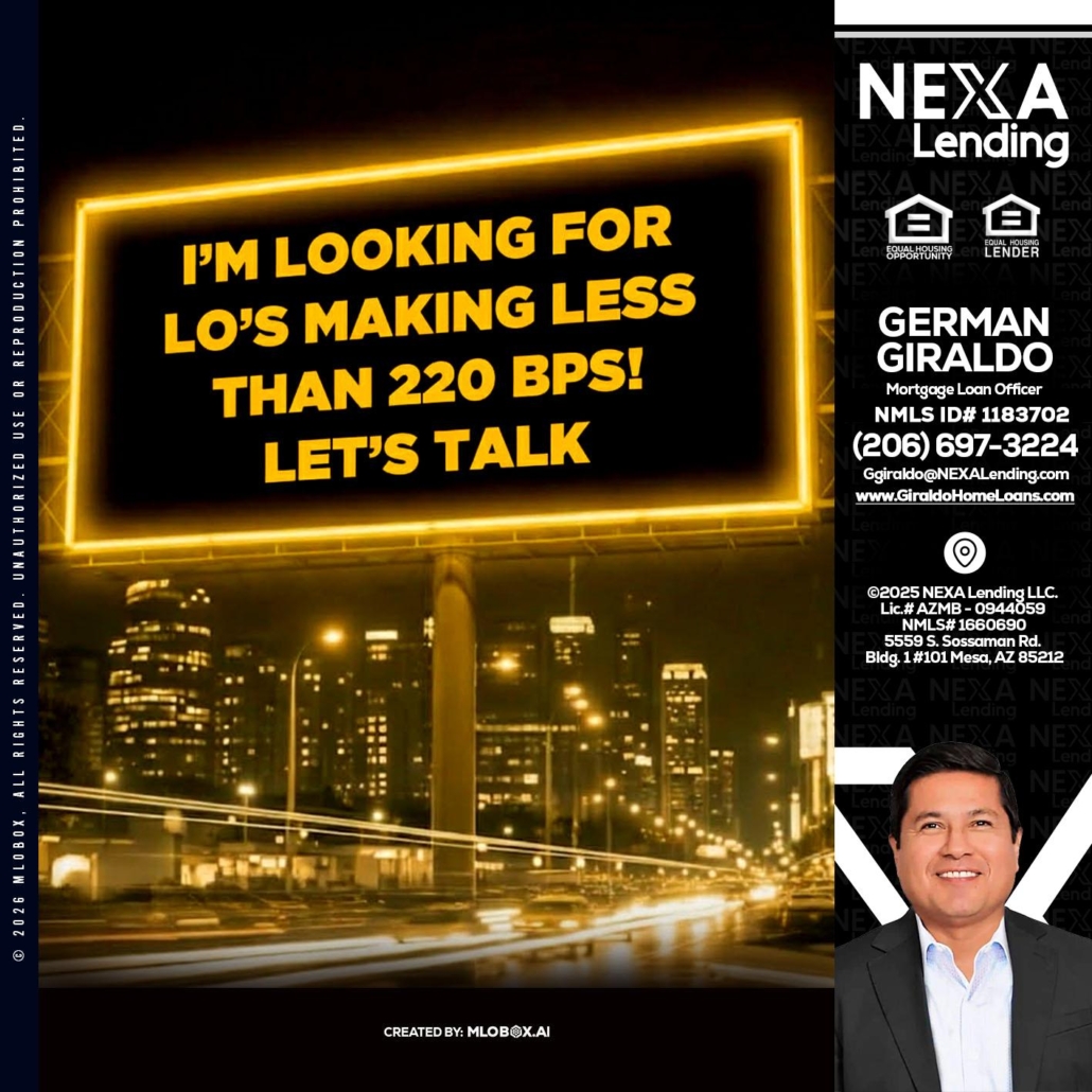 Looking for MLOs - German Giraldo -Mortgage Loan OfficerHi, my name is German Giraldo. I’m a Loan Officer with NEXA Lending LLC., offering personalized mortgage solutions, fast customized quotes, great rates and service with integrity.