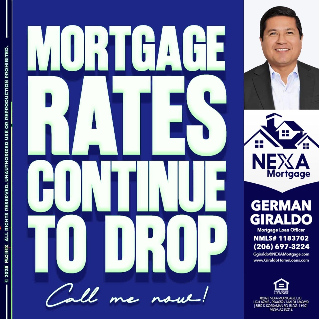 MORTGAGE RATES - German Giraldo -Mortgage Loan OfficerHi, my name is German Giraldo. I’m a Loan Officer with NEXA Mortgage LLC., offering personalized mortgage solutions, fast customized quotes, great rates and service with integrity.
